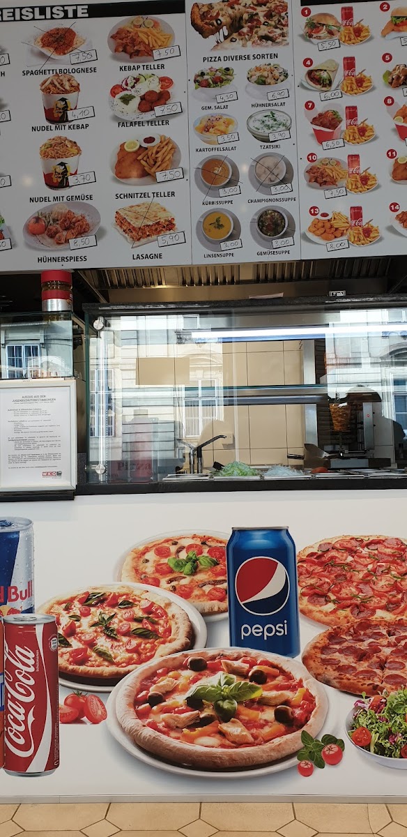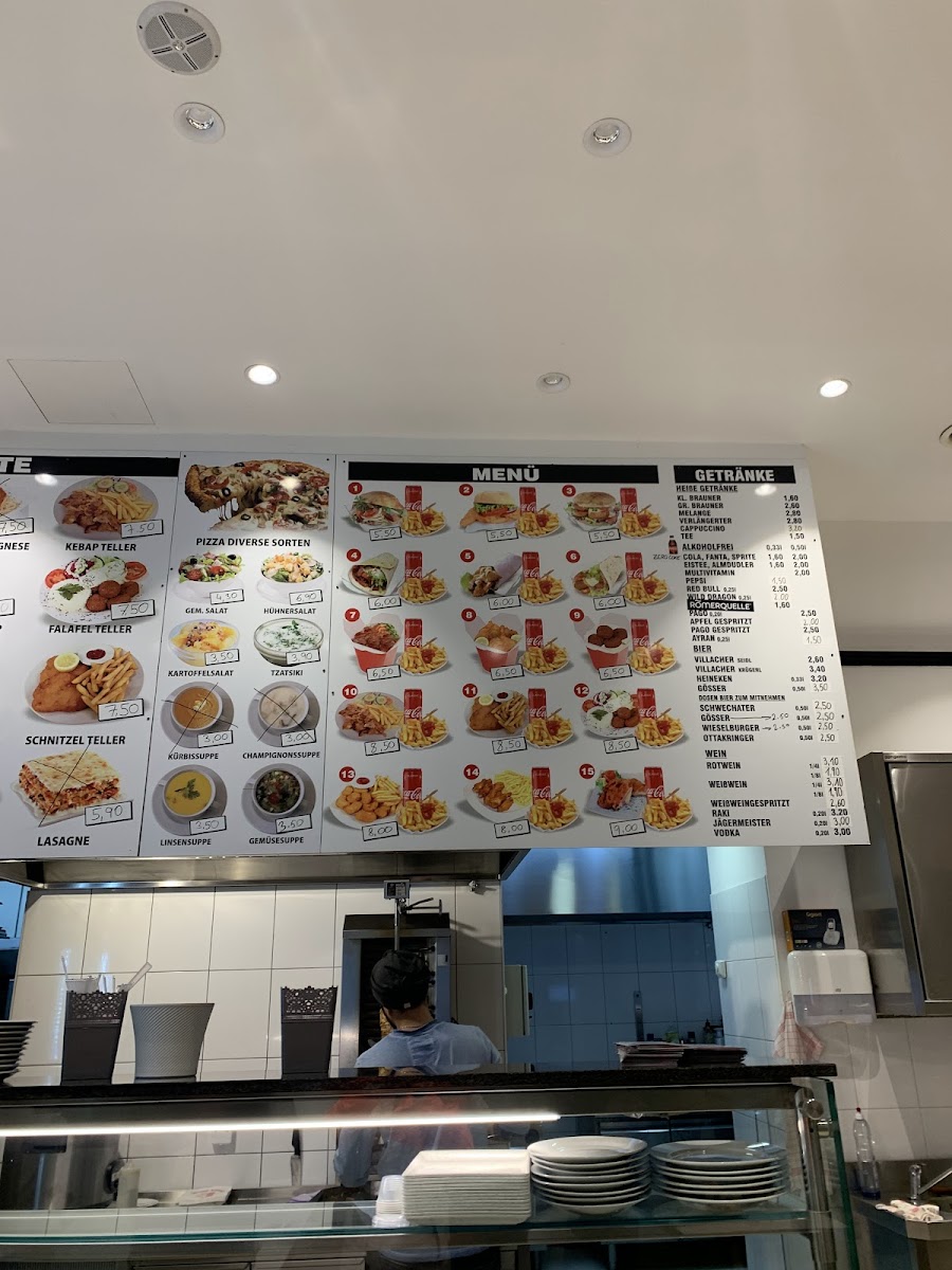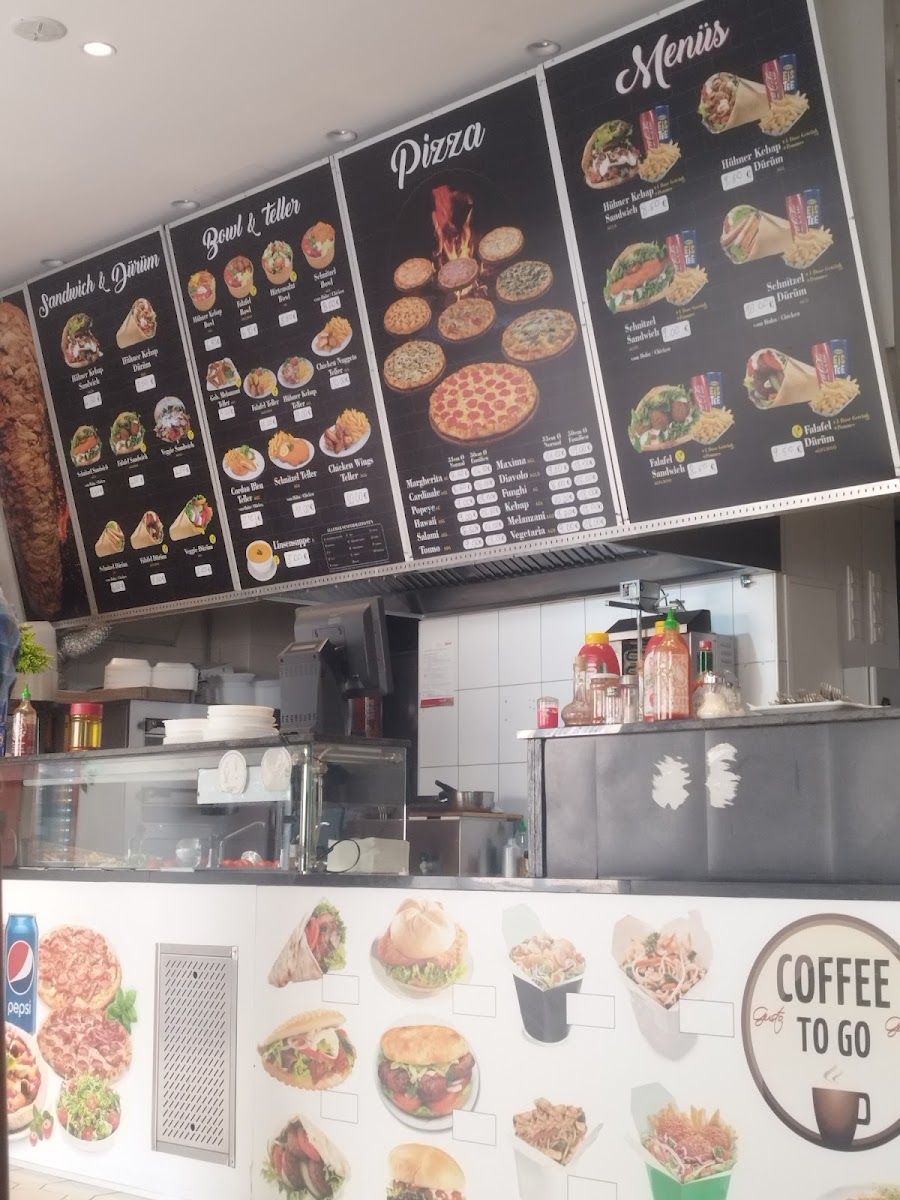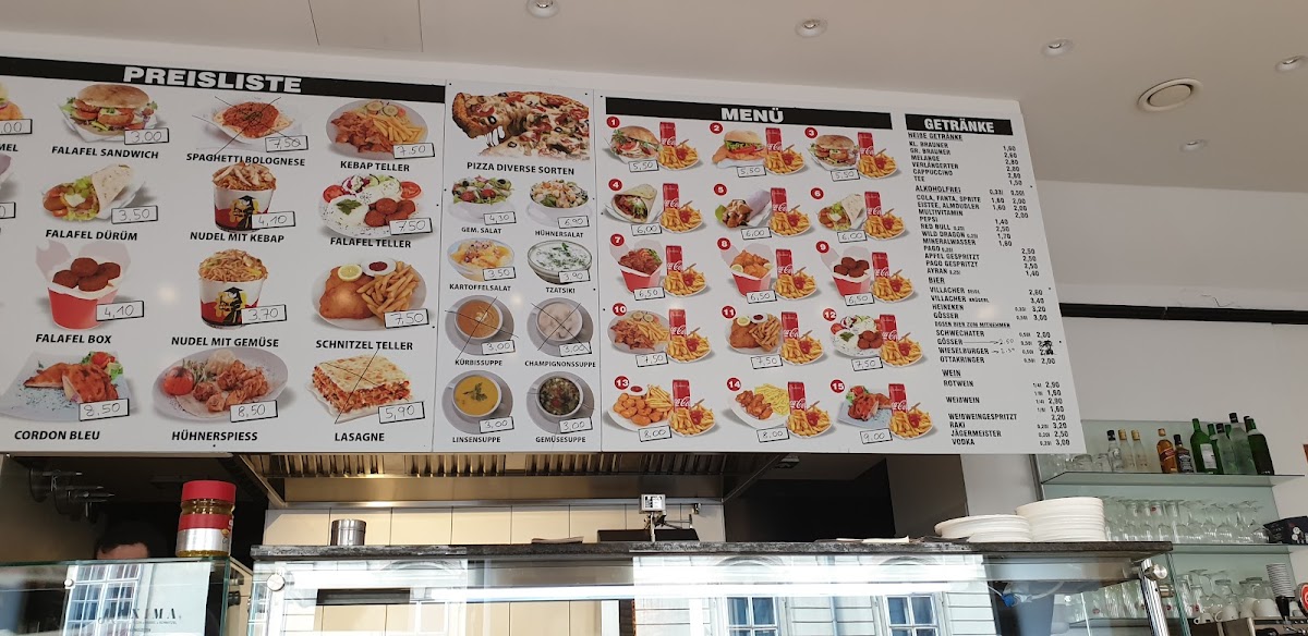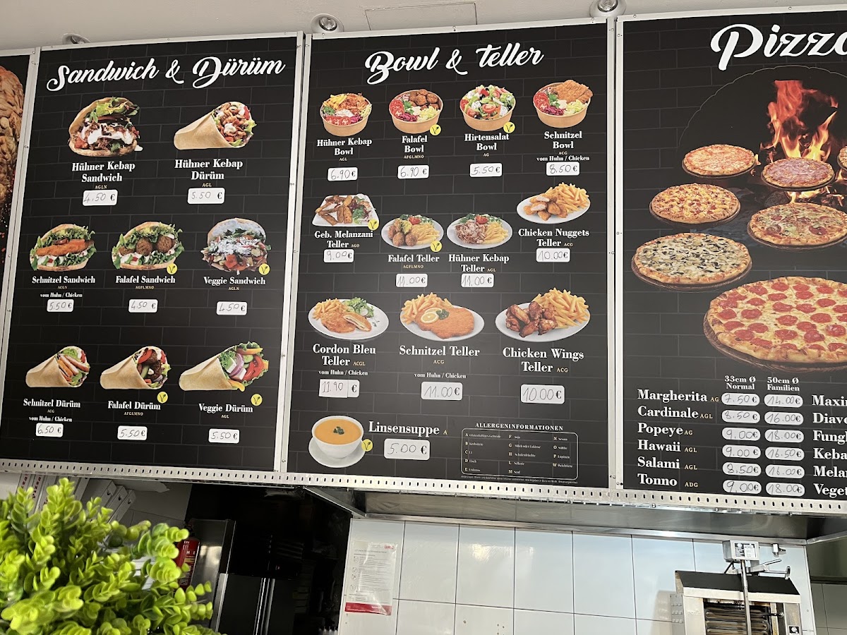 Among the highlights, you’ll find freshly prepared falafel options like the Falafel Durum and Falafel Teller, as well as heartier choices such as Cordon Bleu vom Huhn. The menu also features a range of pizzas—from classic Маргарита to the more robust Мясная Пицца—each made with care and simple ingredients. For those desiring a filling plate, dishes like the Döner-box served with rice, fries, and a generous touch of Schafkäse are popular picks.